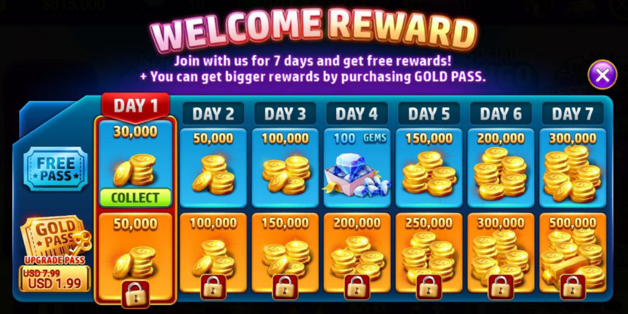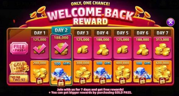 Upon logging in each day, you will encounter the welcome reward board. Claim your daily free rewards, which are available in three types: Welcome Reward, 7 Days Reward, and Welcome Back Reward. The color of the rewards will vary based on your user status.
