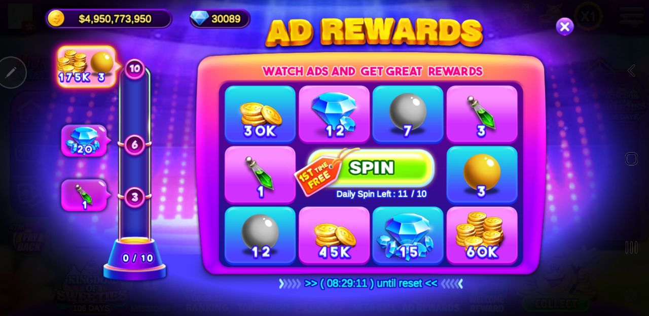 Head to “AD Rewards” to see how you can collect over 10 free rewards every day. You can also watch other rewarded videos within the game to collect free coins and valuable items.