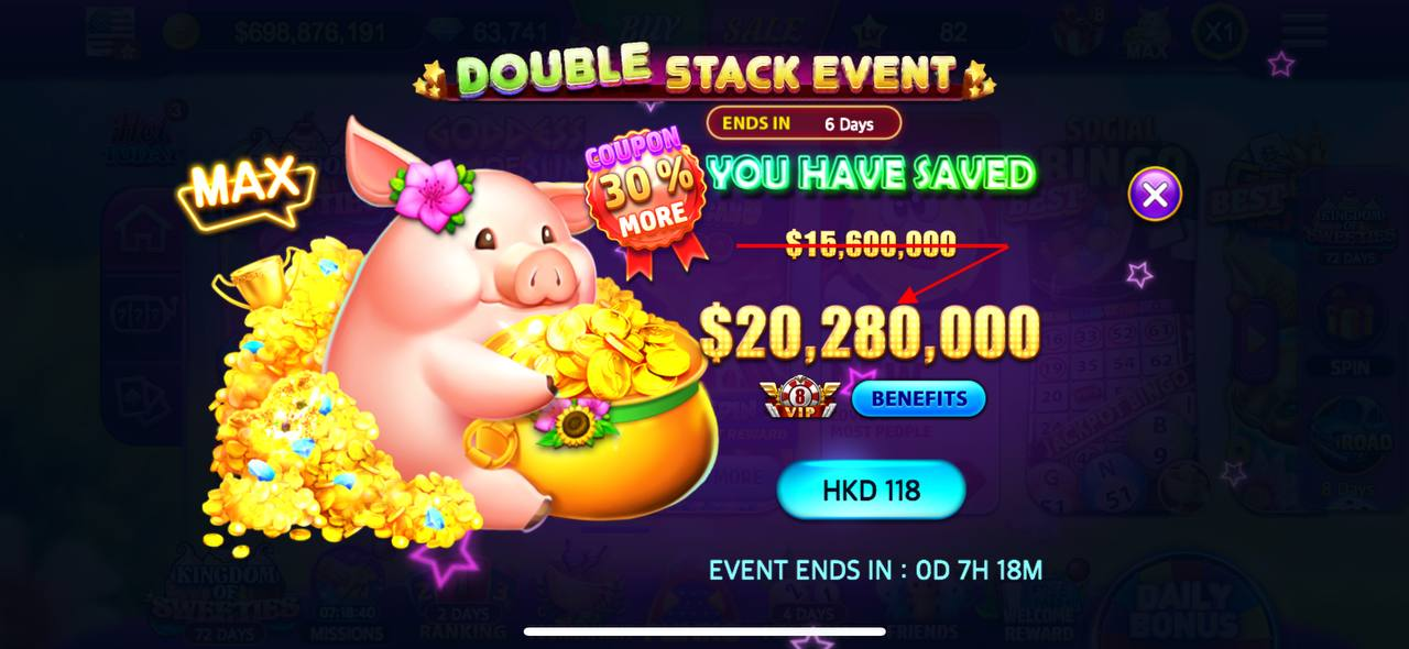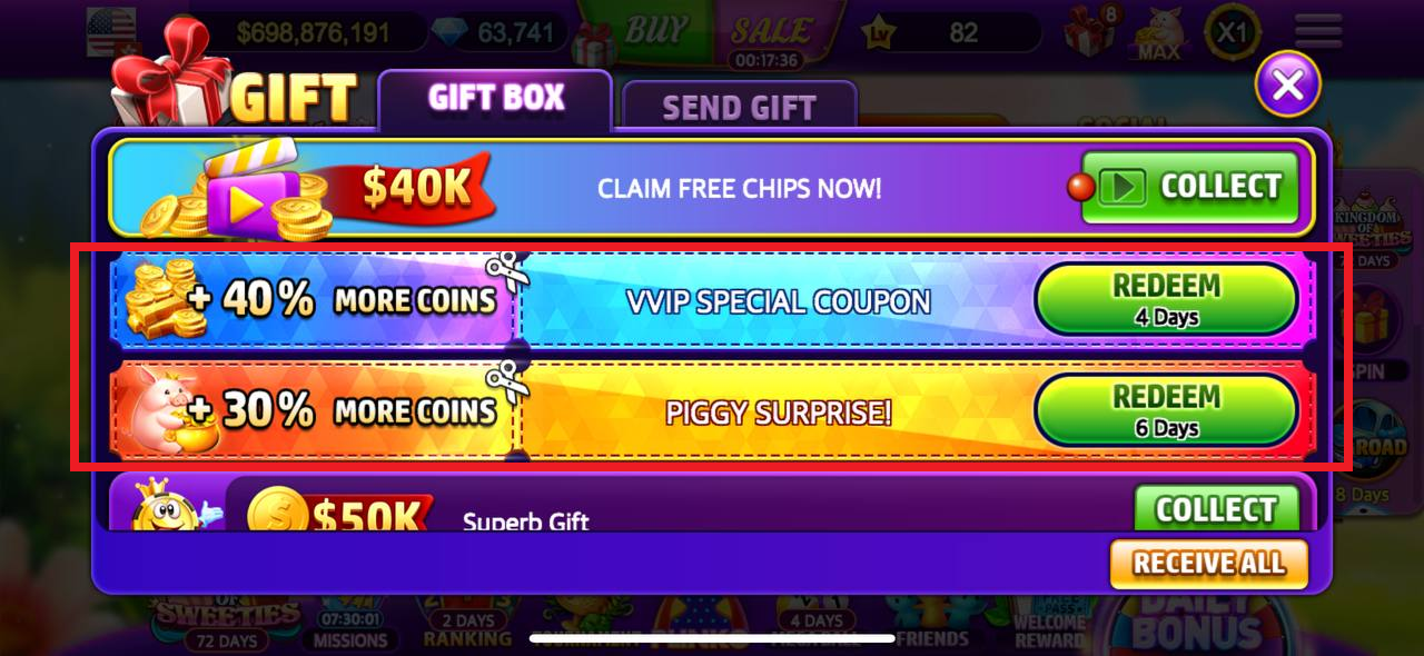 A "Shop Coupon" is a special promotional offer that grants users access to exclusive items in Full House Casino. There are two types of these coupons: "Special Coupon" and "Piggy Coupon". These unique offers appear randomly in the in-game gift box from day to day. Stay updated with the latest news on our social media and newsletter for more details.
