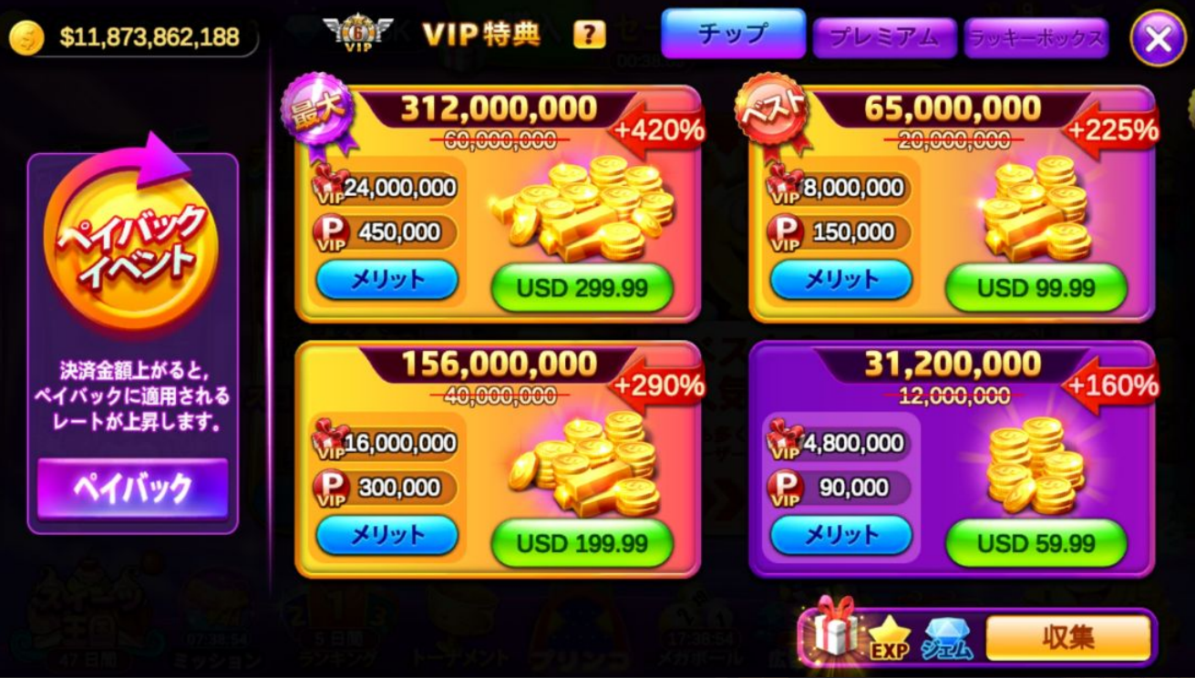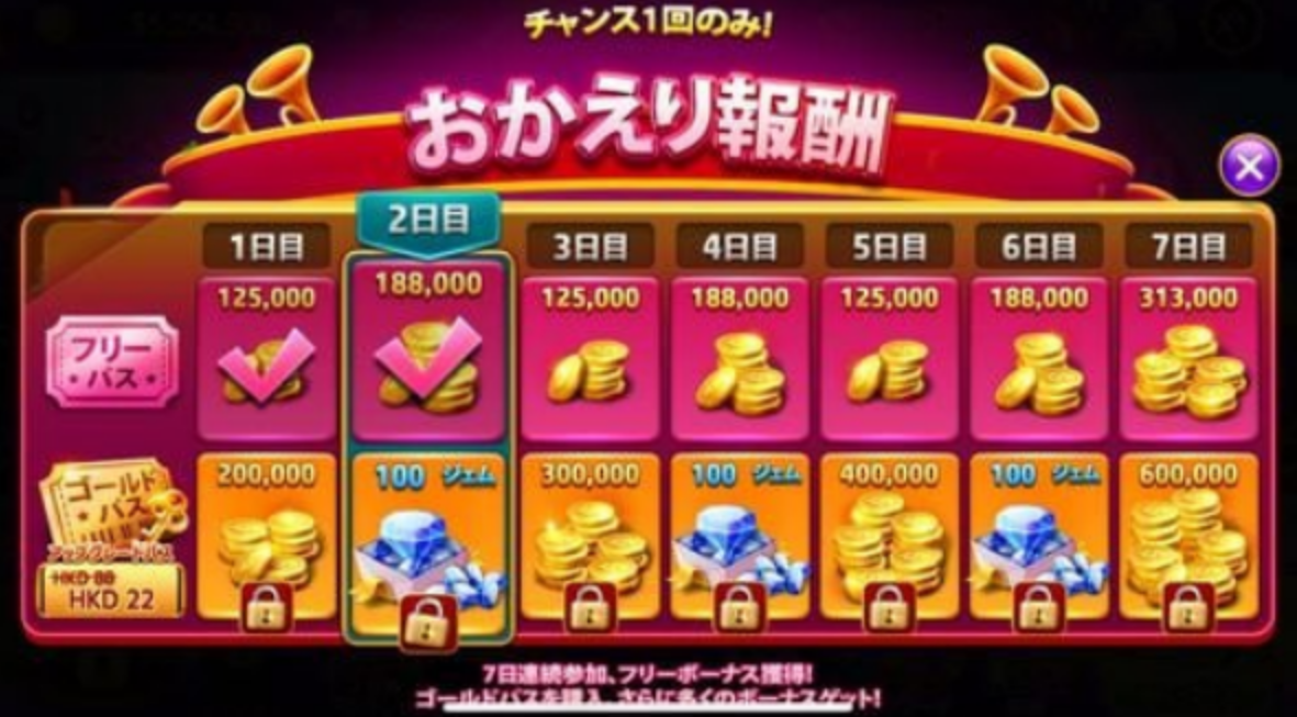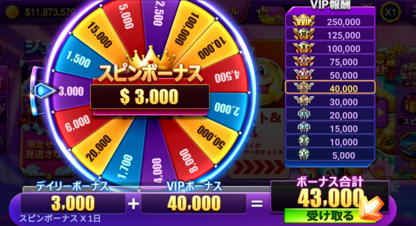 毎日ゲームにログインして、ホイールを回してデイリーやVIPボーナスを受け取りましょう。
