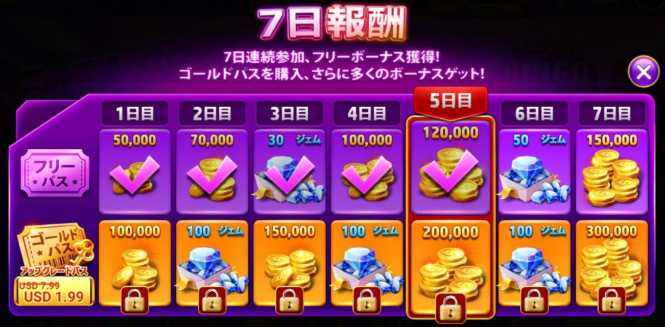 毎日ログインすると、ログイン報酬のパスが表示されます。皆勤賞を目指してログイン報酬を毎日受け取りましょう。