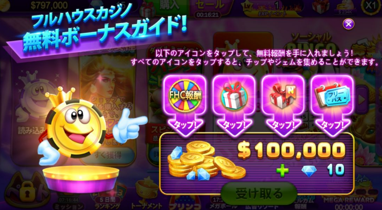 フルハウスカジノでは、購入せずにさまざまな無料報酬を獲得することができます。