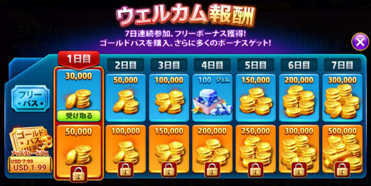 ウェルカムリワード、7日報酬、おかえり報酬との3種類があります。