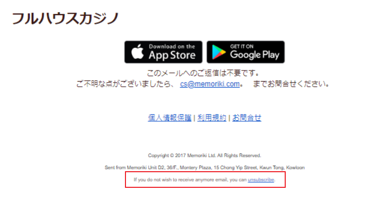 メールマガジンの配信を停止したい 2024年09月04日 03:08 更新 メールマガジン配信停止の方法 メールマガジンの受信を停止するには、メールの一番下にある「unsubscribe」ボタンをクリックしてください。または、サポートチームに直接連絡して購読をキャンセルすることもできます。 購読解除すると、メールマガジンや無料報酬、イベント、オファーの受信が停止されます。いつでも再度購読することができます。 サポートをご希望の場合は、どうぞカスタマーサポートまでお問い合わせください。効率的な対応を提供するため、ユーザーIDとユーザー名を予めご用意ください。 関連記事 ゲームにログインできない場合 メールマガジンの登録方法を教えてください。 所持チップやジェムが無くなった場合 チップとジェムを他人と交換してもいいですか? ゲーム言語を変更したいです。