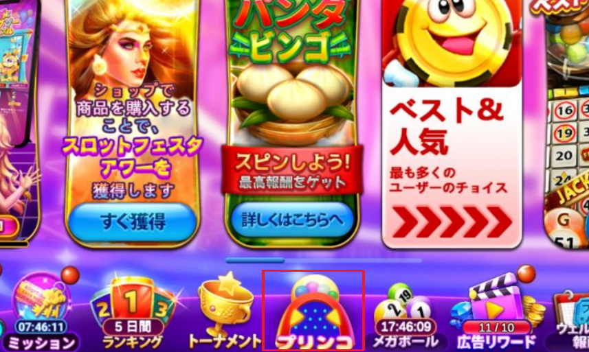 ロビー下部の中央にある「プリンコ」アイコンをタップして入場できます。