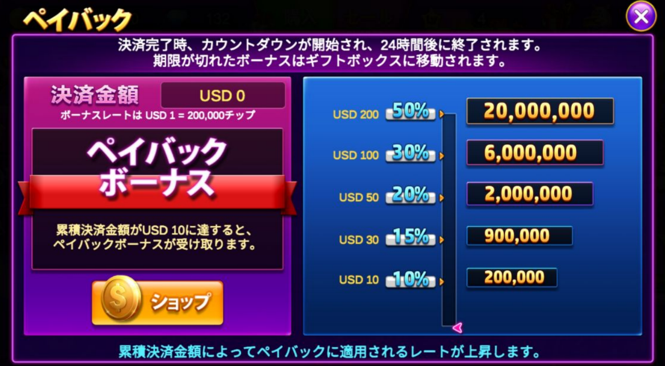 ペイバックボーナスの金額は、ボーナス率によって異なり、USD1ドル⇔200,000チップとの換算レートで計算されます。