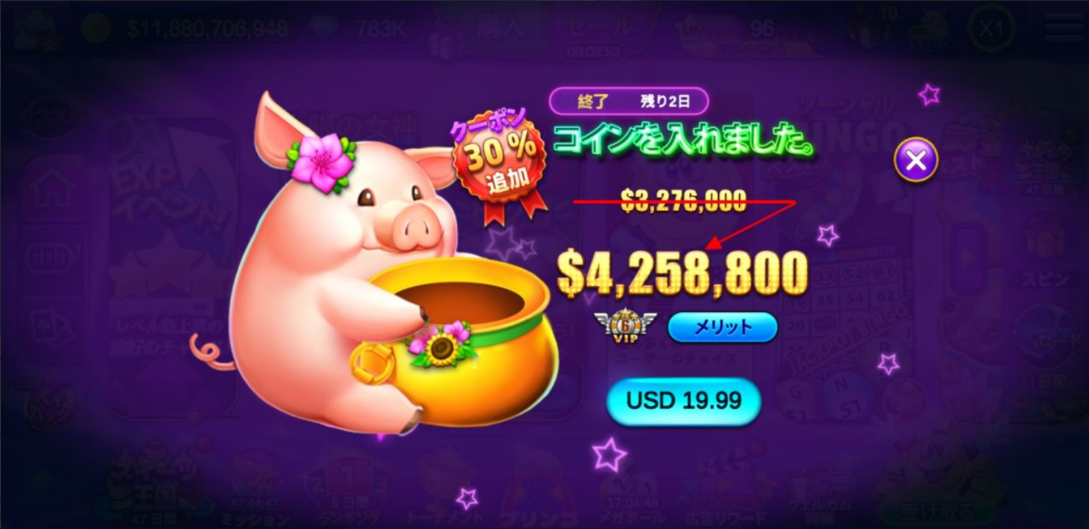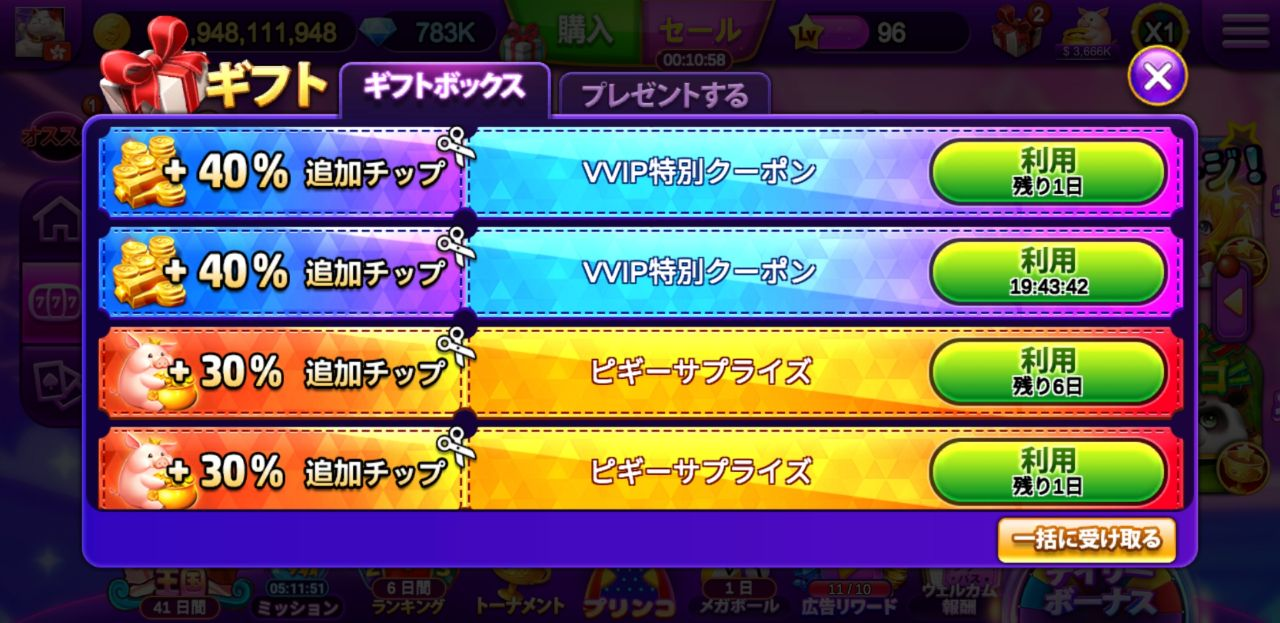 このピギーちゃんからのクーポンを利用すると、「ピギーのポット」のチップ量が30%に増量します。ピギーのポットで一定の数量を累積した時に使うとさらに有利であり、最大限に活用することができます。