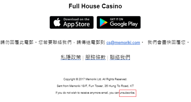 如何取消訂閱我們的電子報? 2024年07月09日 01:31 更新於 取消訂閱電子報 要停止接收我們的報,請在任何電子郵件的底部點擊「unsubscribe」按鈕取消訂閱。或者,直接聯繫我們的客服支援取消您的訂閱。 取消訂閱後,您將不再收到我們的優惠通訊、免費獎勵和活動通知。您亦可以隨時重新訂閱。 如需更多協助,請與客服支援聯繫並預先準備您的帳號的遊戲ID和玩家稱號以讓我們更有效率地為您服務。 相關文章 我不能登入遊戲 如何訂閱我們的電子報? 我的籌碼或寶石不見了 我可以與其他人交易金幣或寶石嗎? 如何更改遊戲語言?