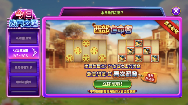 您可以點選位於屏幕左上角的"今日熱門之選"圖示來查看活動內容。每週都有不同的老虎機或桌上遊戲「雙重任務」等待著您。