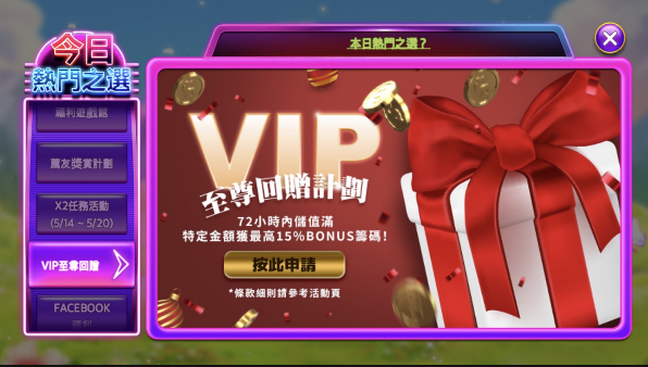 - 在左側方選單往下拉動至「VIP至尊回贈」。
